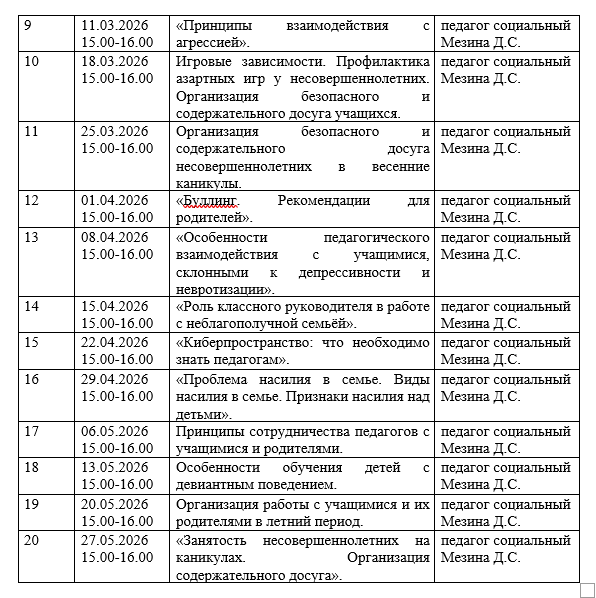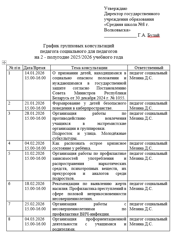 График групповых консультаций педагога социального для педагогов