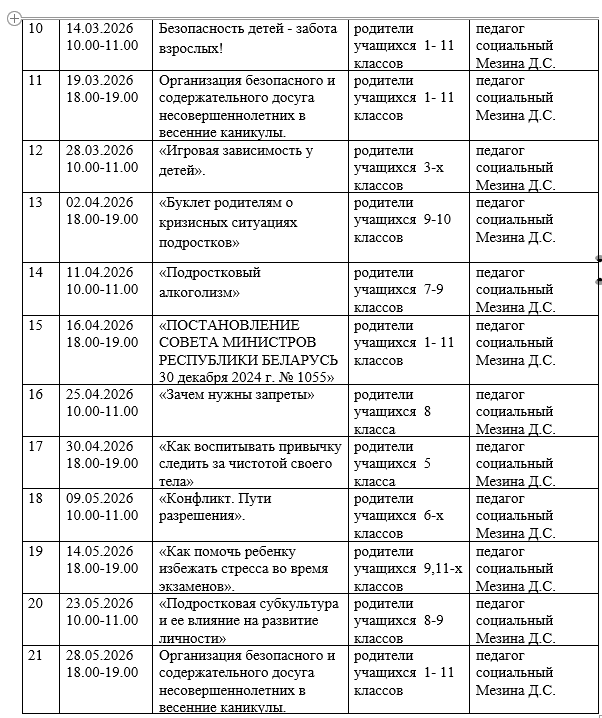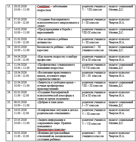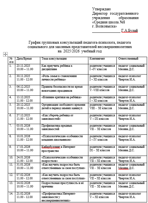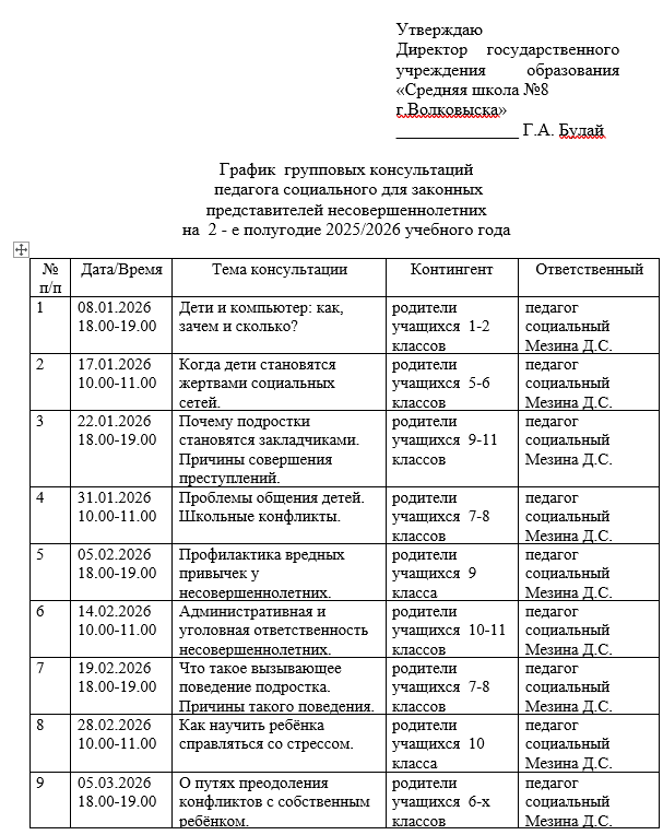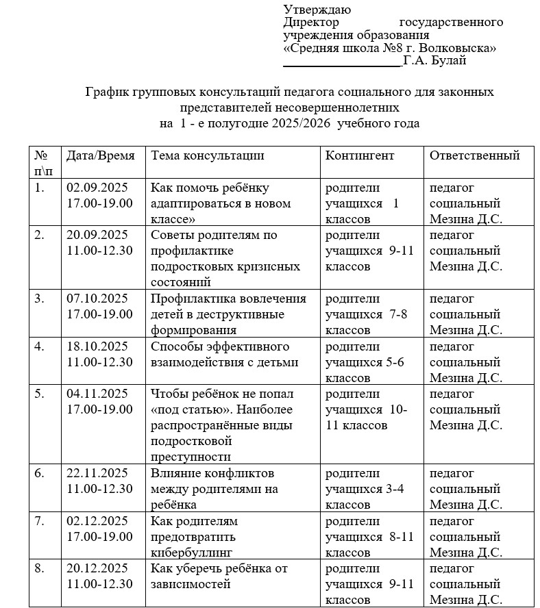 График групповых консультаций педагога социального для законных представителей несовершеннолетних